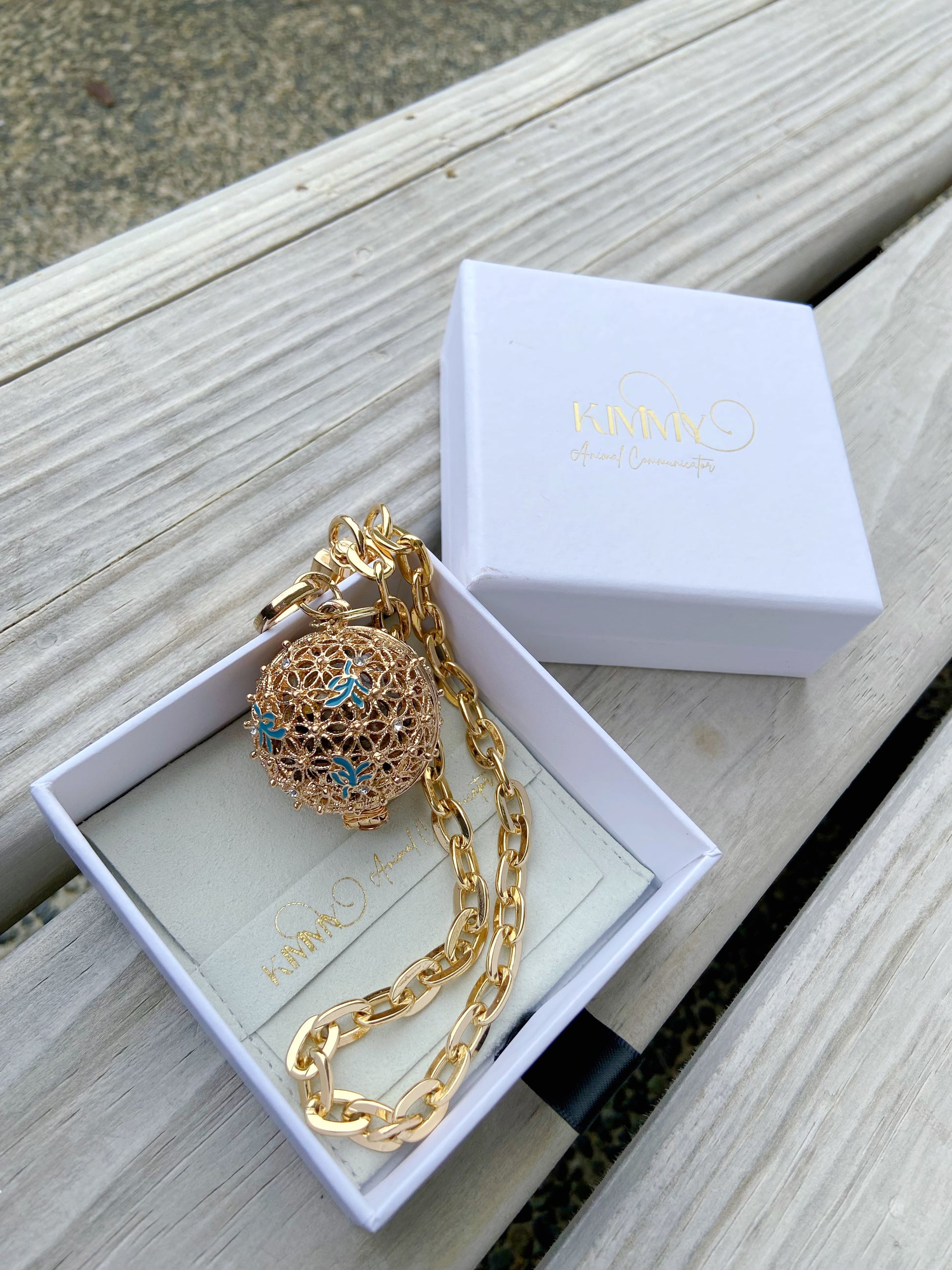 - Exquisitely crafted Tiffany blue orchid pendant with 3D lace-like golden sphere design (35mm diameter)