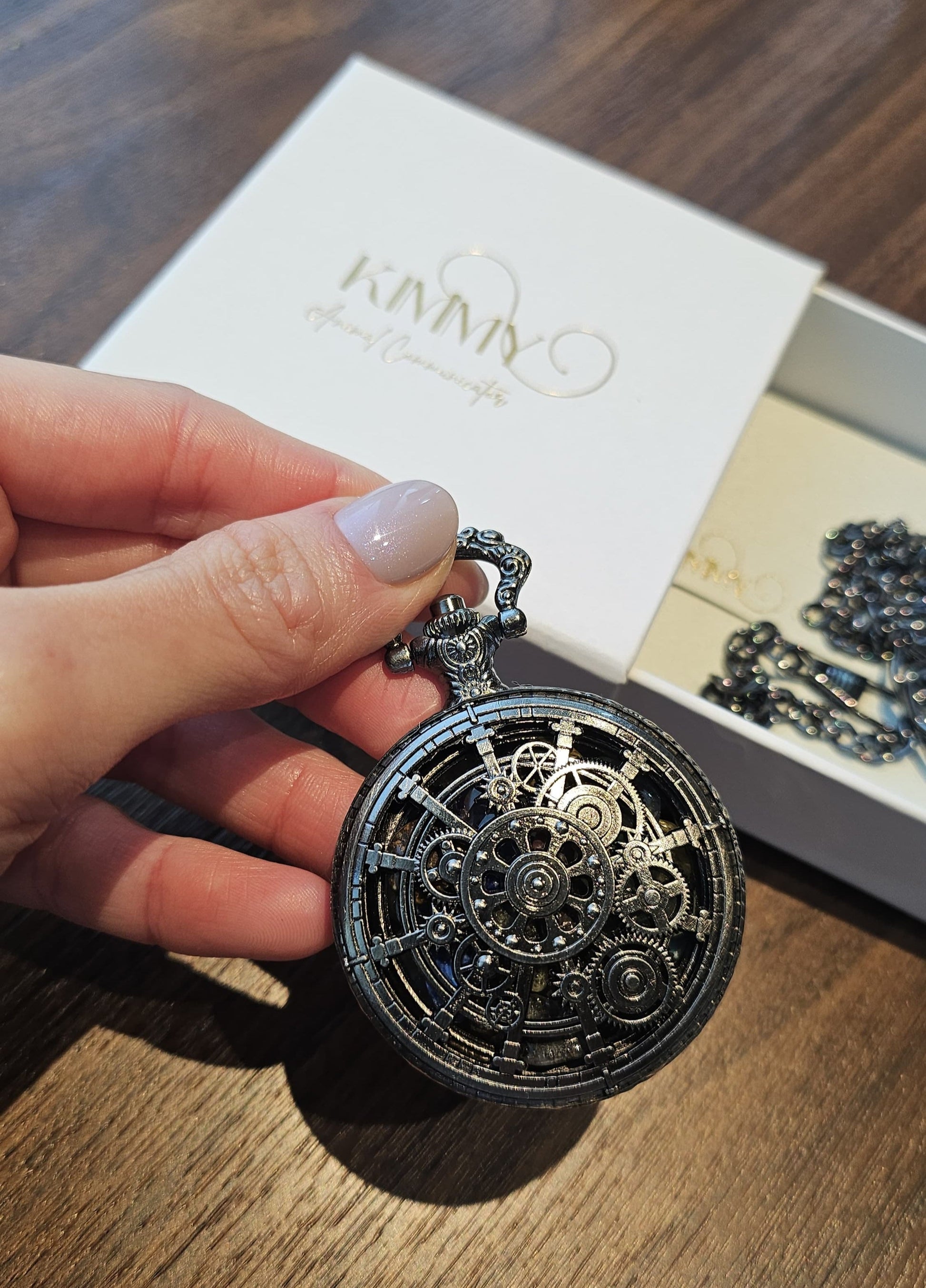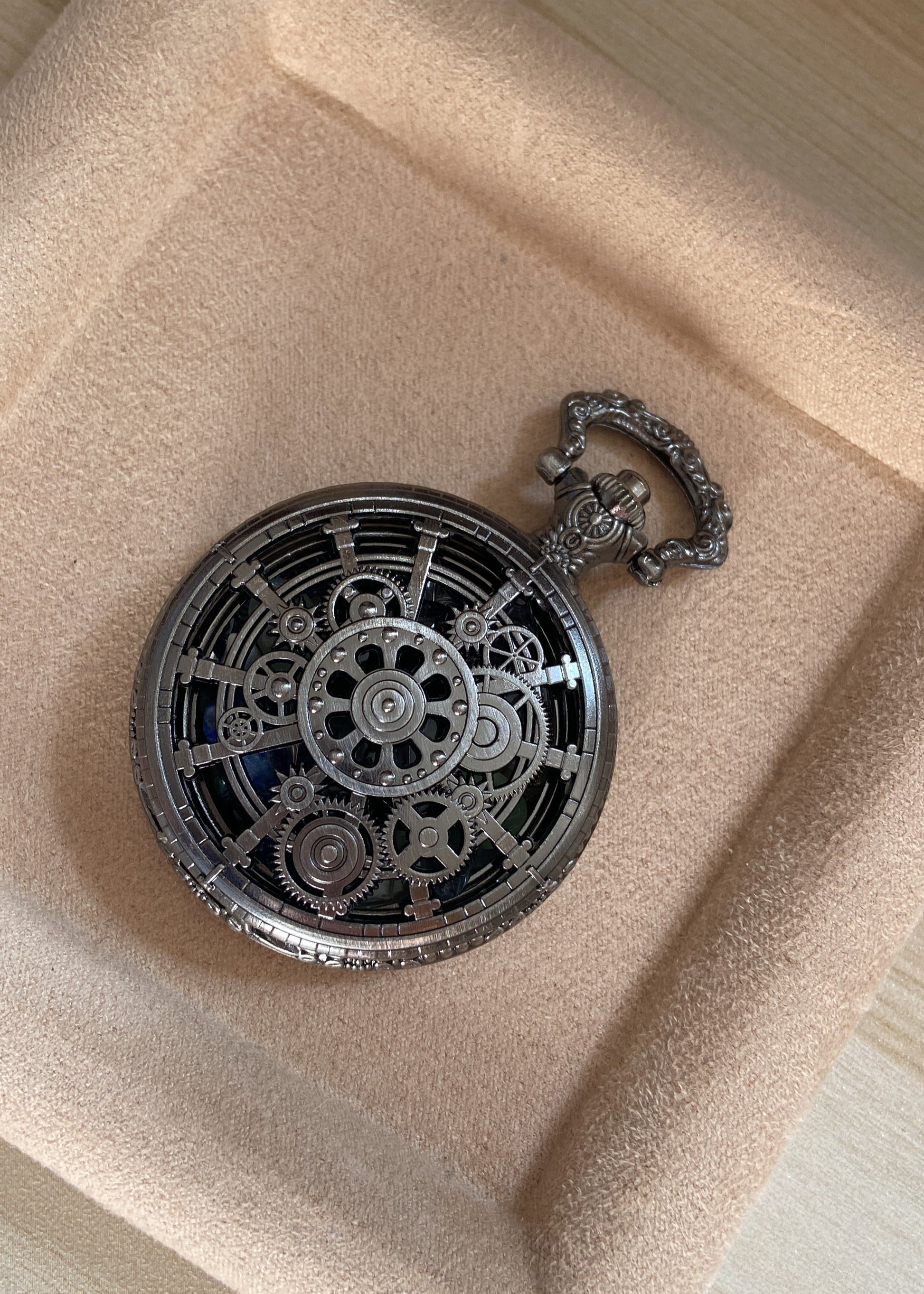 🛠️ Gear-motif floral engravings with vintage pocket-watch charm
